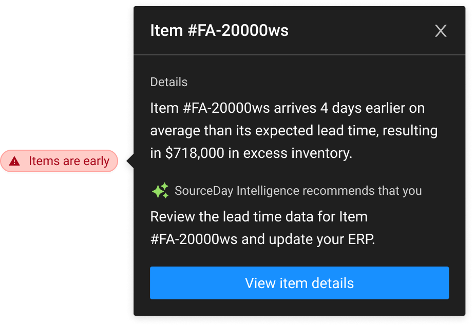 Triggered when SourceDay detects that items are consistently arriving early or later than the promised delivery date. When this risk is identified, SourceDay recommends the following actions: