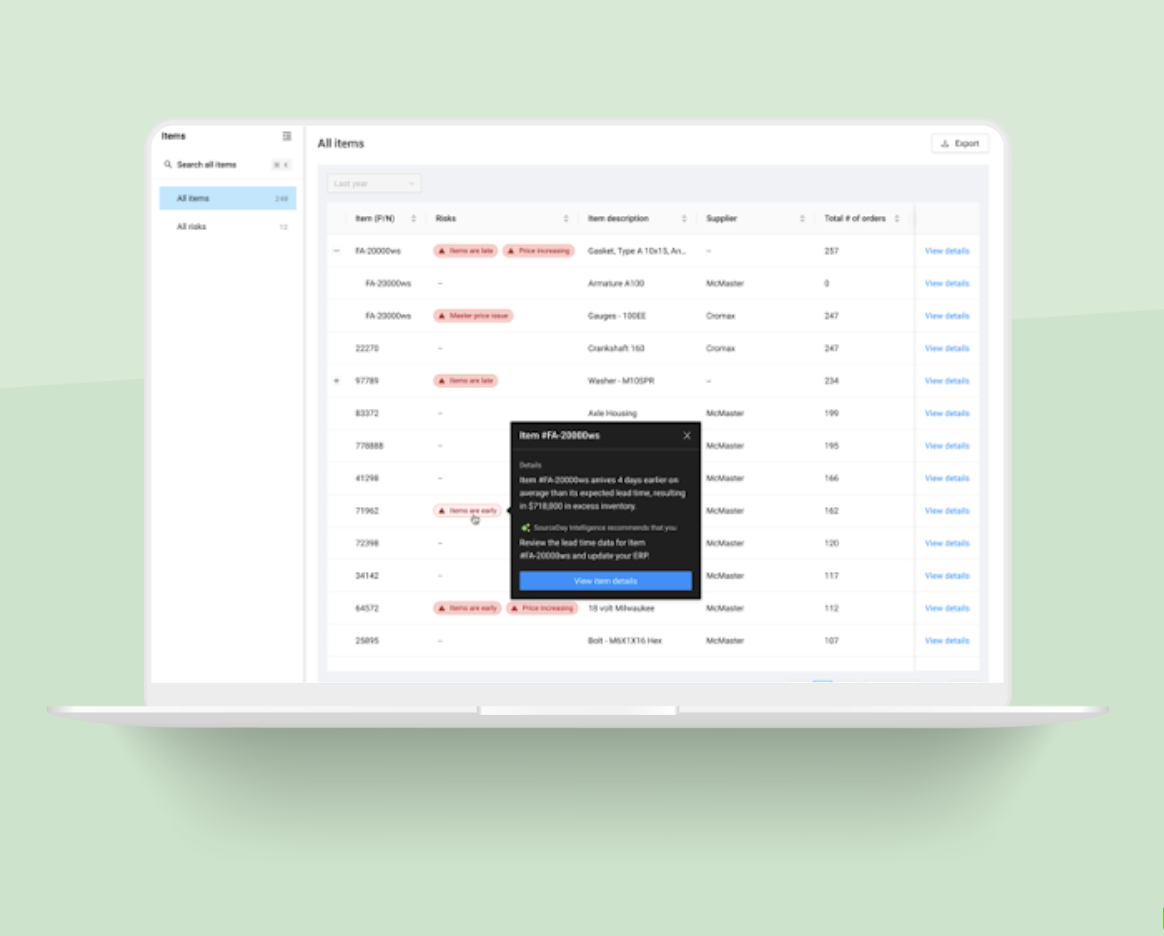 Item Hub gives you full visibility into every SKU in your supply chain, including country of origin, cost history, lead time trends, and SourceDay Intelligence uses AI to identify risk flags such as: