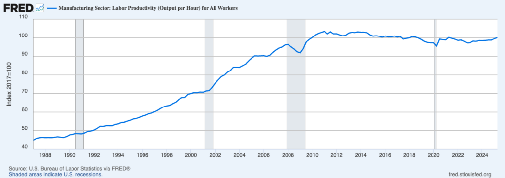As automation expands, value added per employee continues to rise. The U.S. manufacturing sector’s value added per worker has grown by roughly 80% since 2000, reflecting sustained productivity gains even with a smaller headcount.