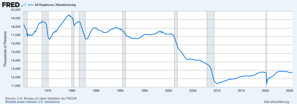 Manufacturing employment peaked at 19.6 million in 1979. Today, it’s around 12.7 million, a decline of one-third over 45 years. Yet despite that contraction, job openings remain persistently high—around 400,000 as of mid-2025—highlighting a growing mismatch between labor supply and modern skill demand.