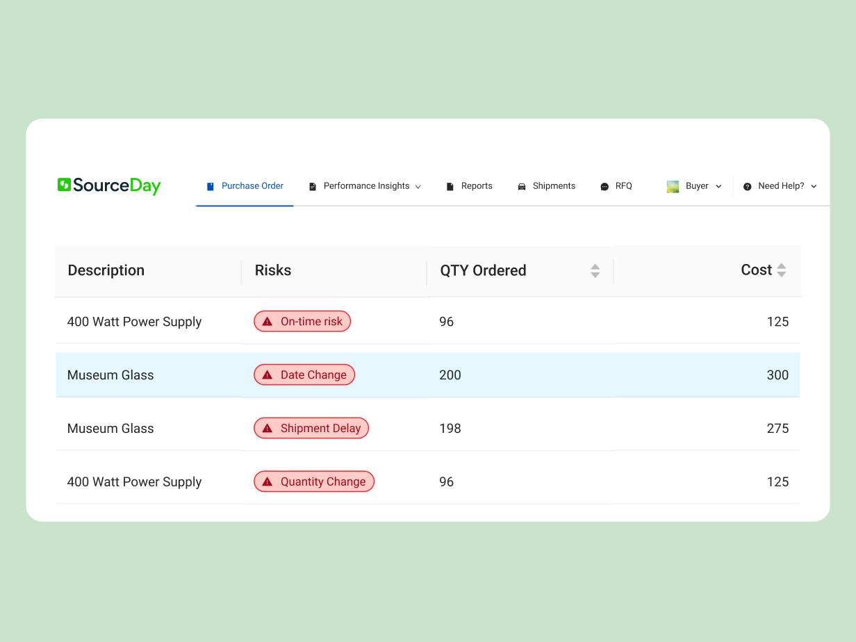 SourceDay prevents costly disruptions in productivity, reduces PO process inefficiency, improves revenue predictability, and boosts financial and operational performance across your organization.