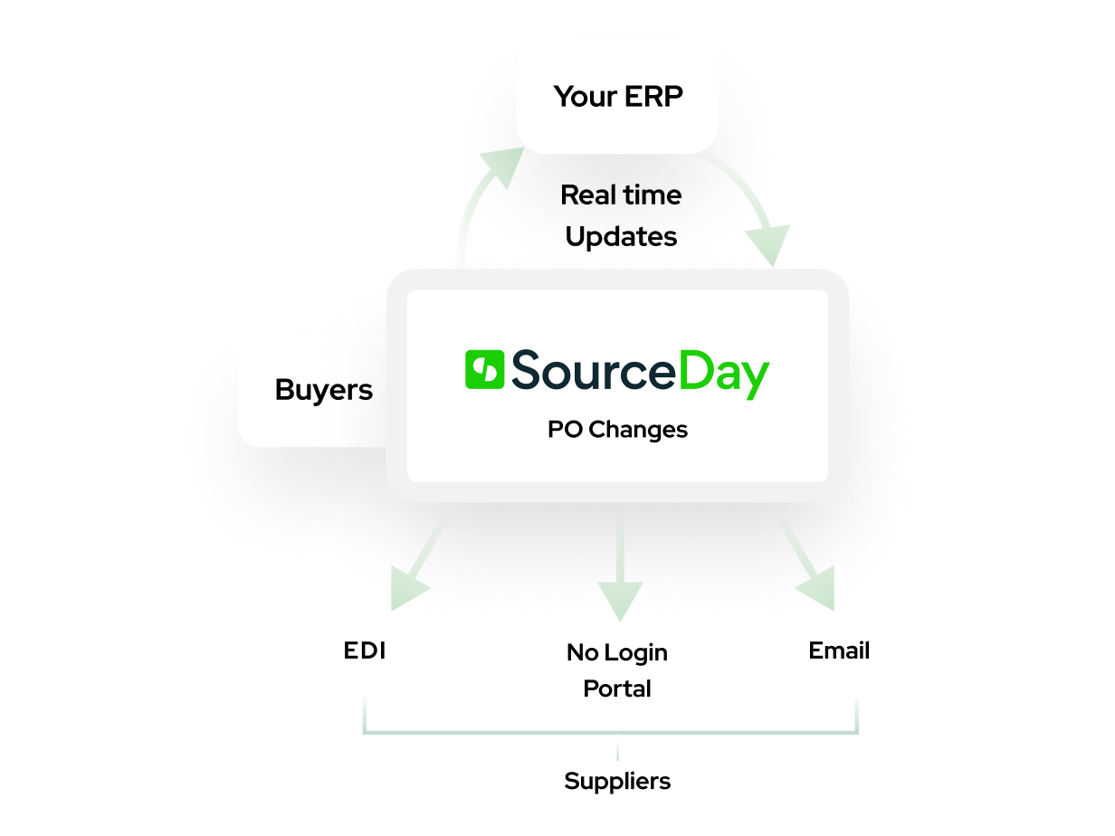SourceDay securely captures data from your ERP near real-time and updates your ERP with any PO changes in real-time. SourceDay not only accurately updates ERP with simple changes such as date, quantity, price but also handles advanced supply chain scenarios such as purchase order splits, partial fulfillment, PO move-ins and move-outs. SourceDay keeps all trading partners aligned and on the same page with accurate PO data, always. SourceDay also provides 100% PO email delivery to suppliers during entire PO Lifecycle.